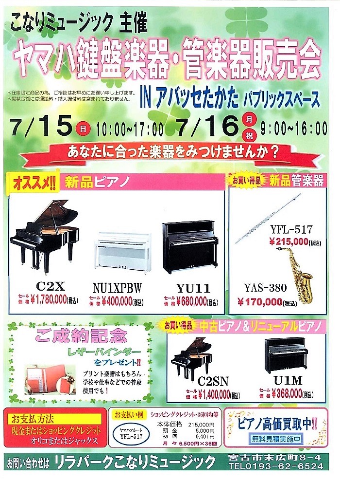 楽器(ピアノ・エレクトーン・電子ピアノ・管楽器)の販売とミニコンサートを開催いたします。