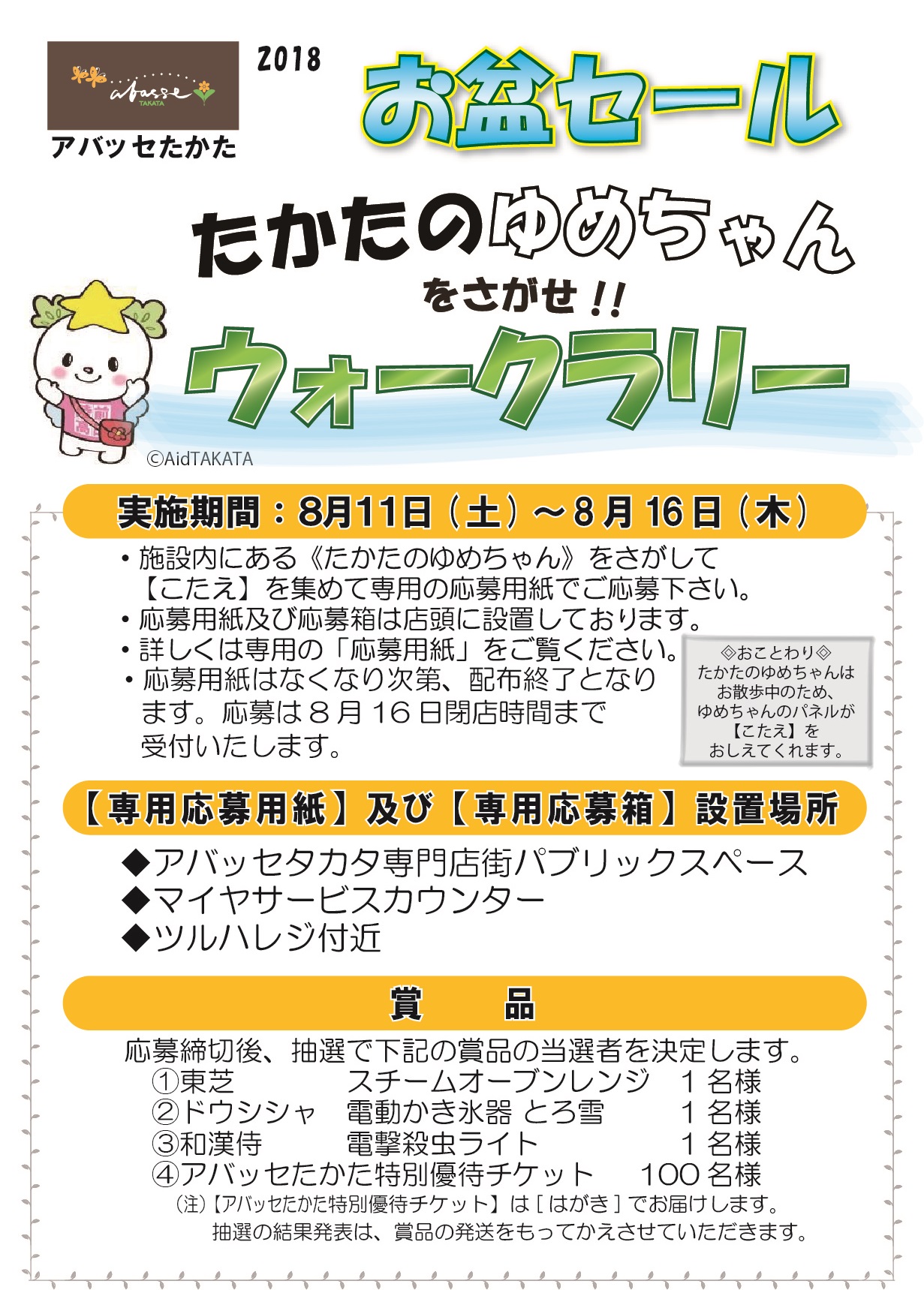 【たかたのゆめちゃんをさがせ!!ウォークラリー】を開催いたします。