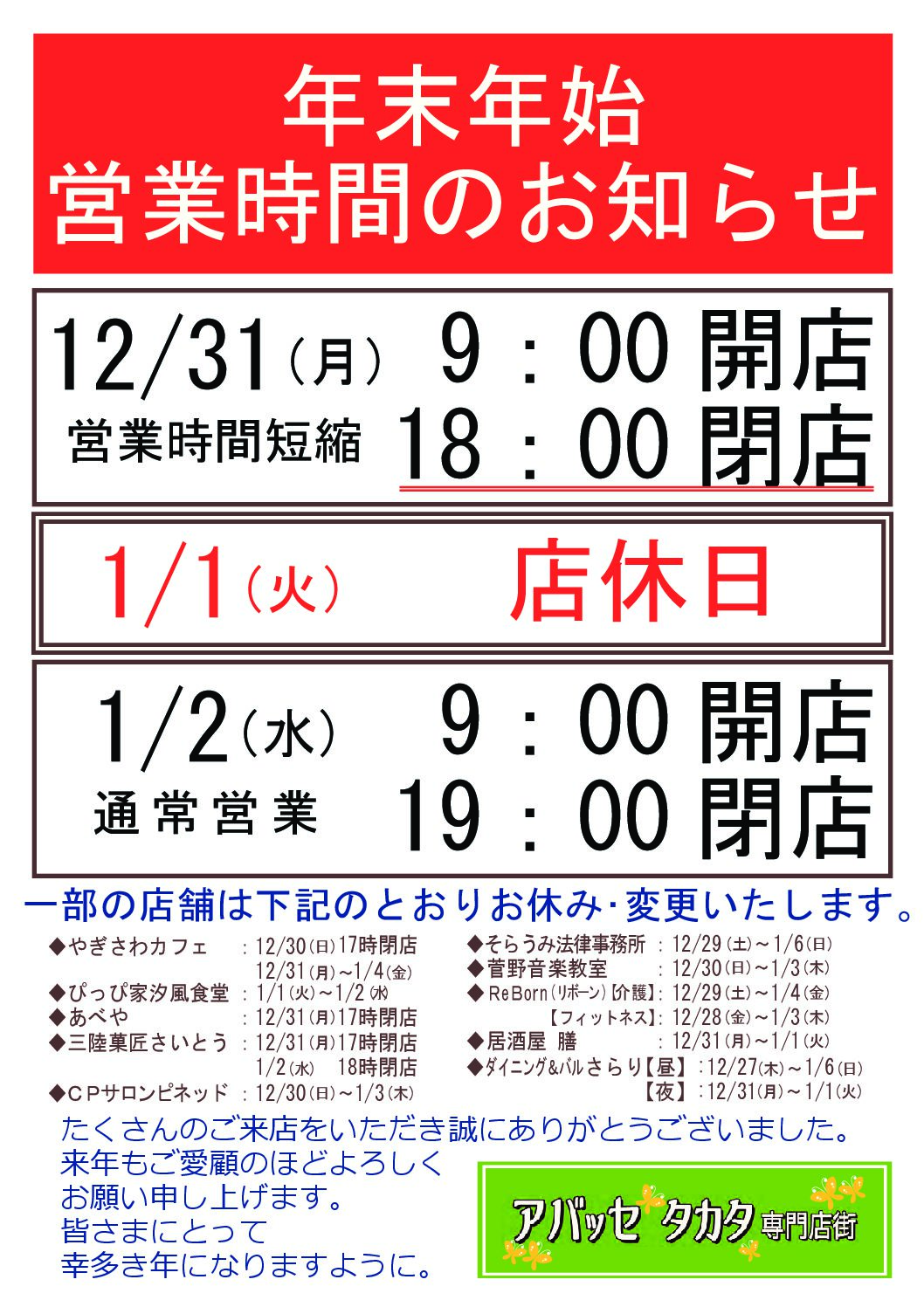 年末年始の営業時間変更についてお知らせ申し上げます。