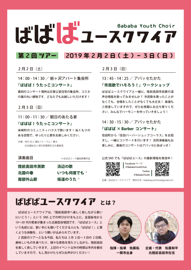 ばばばユースクワイアではFacebookとTwitterで情報発信をしております。 是非、下記アドレス ↓ にアクセス下さい。