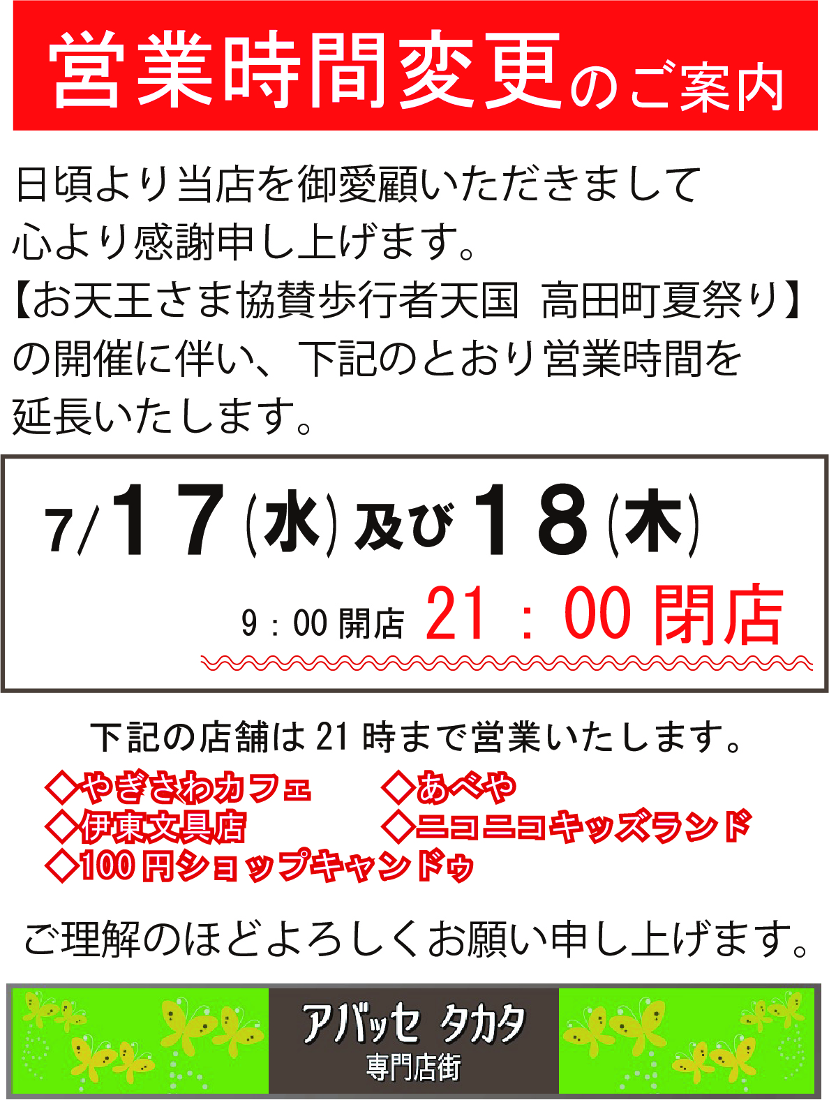 営業時間変更のお知らせ~令和元年7月17日(水)~18日(木)~