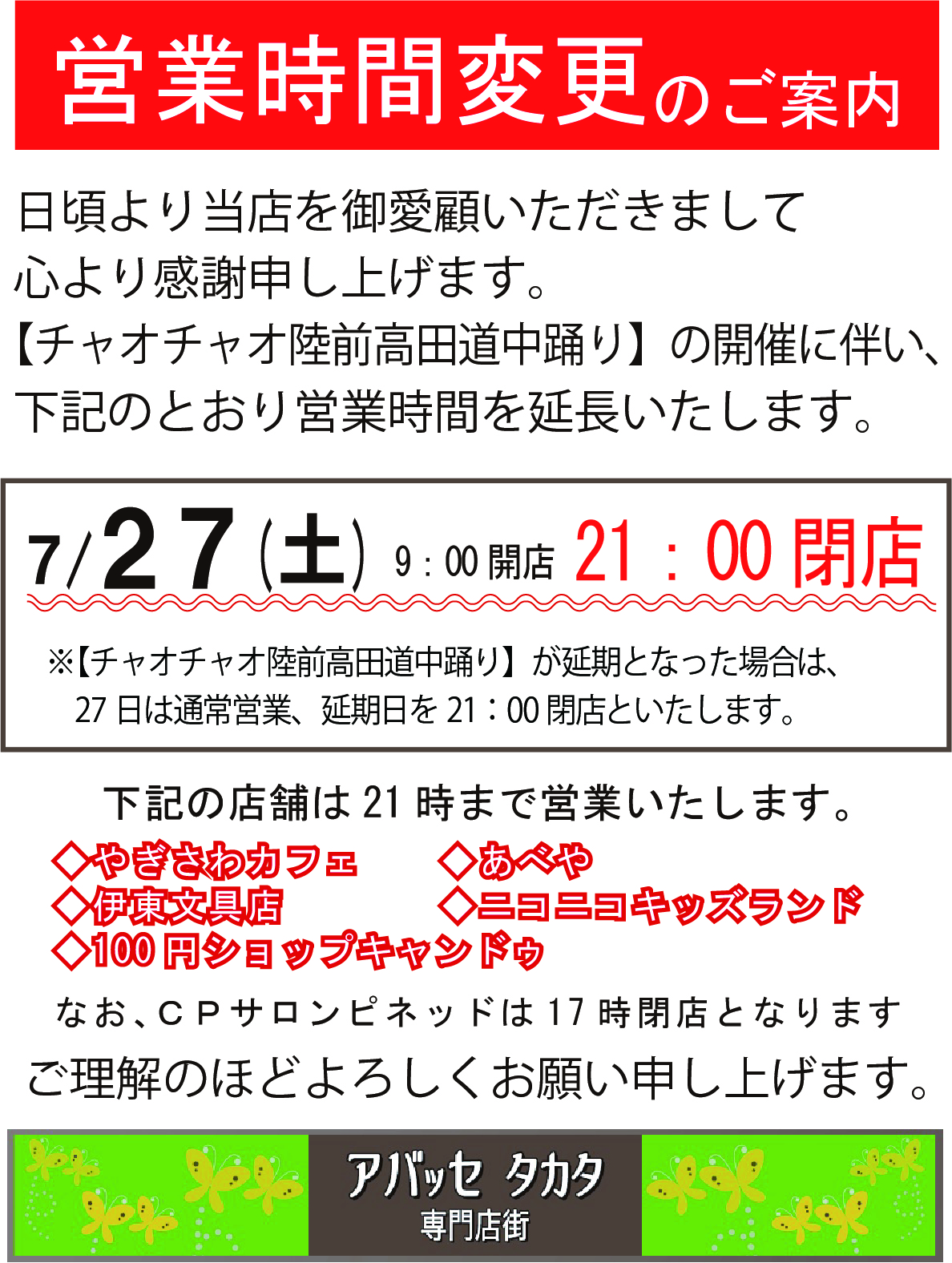 営業時間変更のお知らせ~令和元年7月27日(土)~