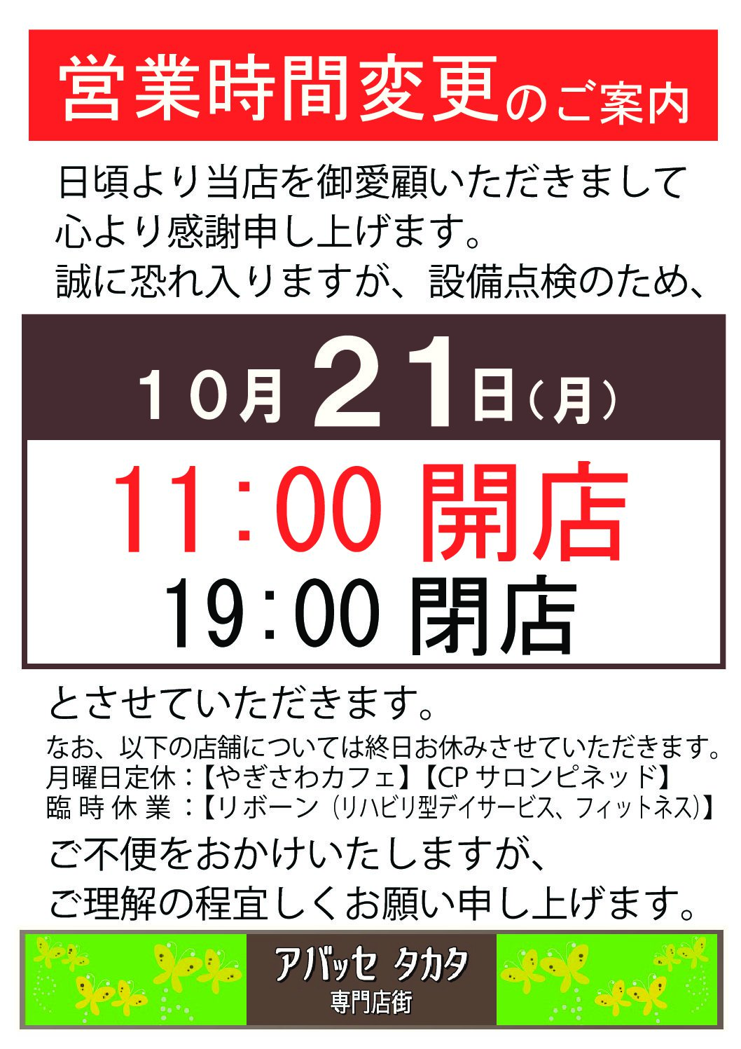 営業時間変更のお知らせ~令和元年10月21日(月)~ (2019/10/11更新)