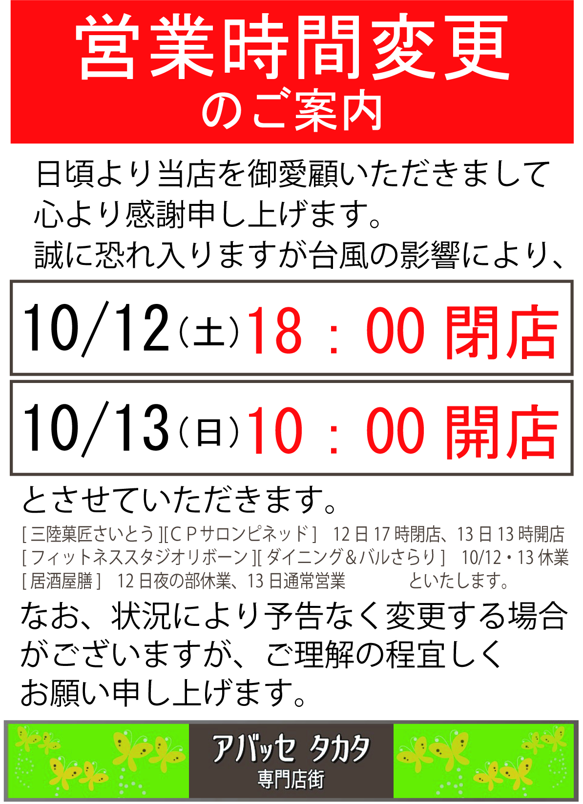 台風の影響による営業時間変更のお知らせ【2019.10.12~10.13】