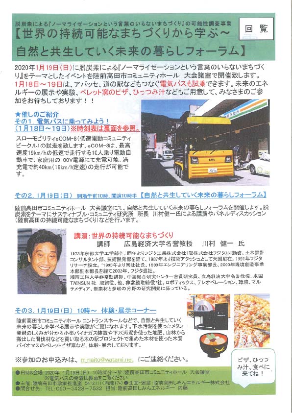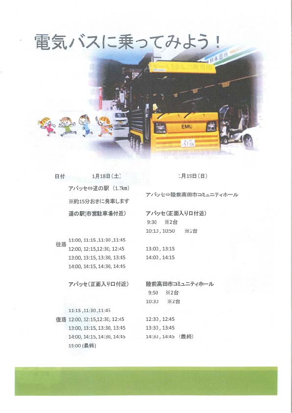 アバッセたかたと道の駅高田松原、陸前高田市コミュニティホール間を試走する、電気バスへの試乗体験ができます。