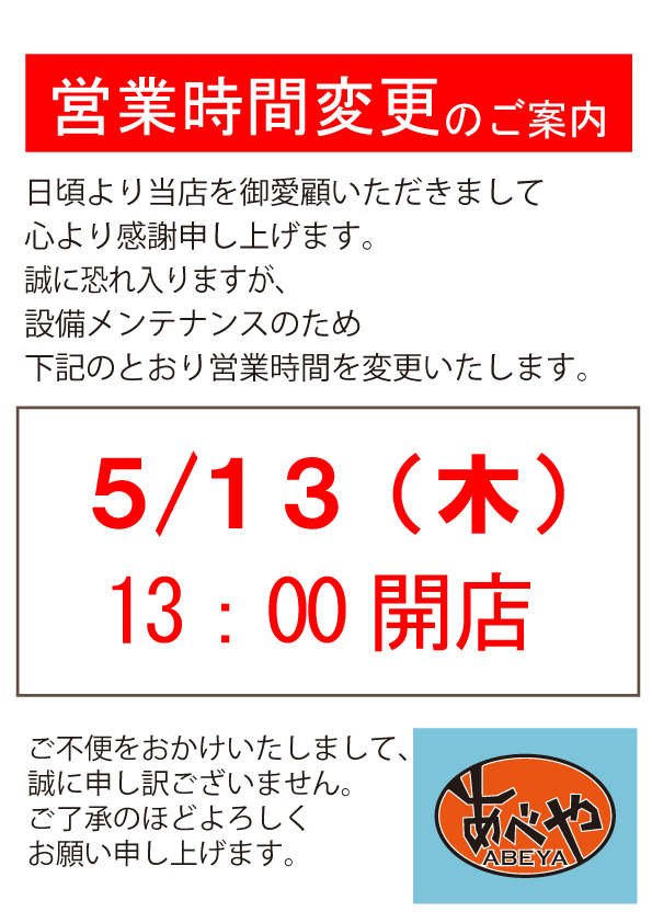 【営業時間変更】あべや
