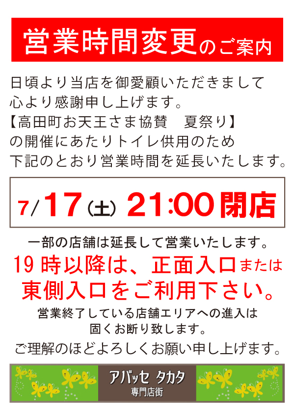 【営業時間変更のお知らせ】2021年7月17日(土)