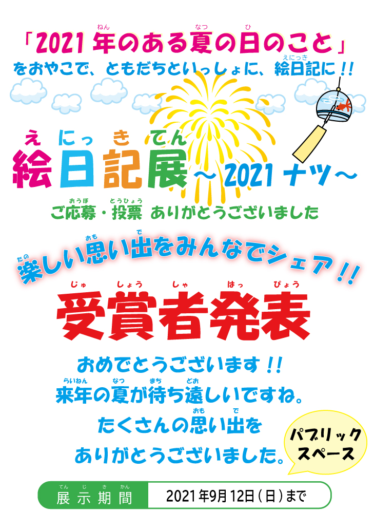 8月16日まで作品の募集をした《絵日記展~2021ナツ~》に、11名の方からひと夏の思い出の絵日記をご応募いただきました。ありがとうございました。