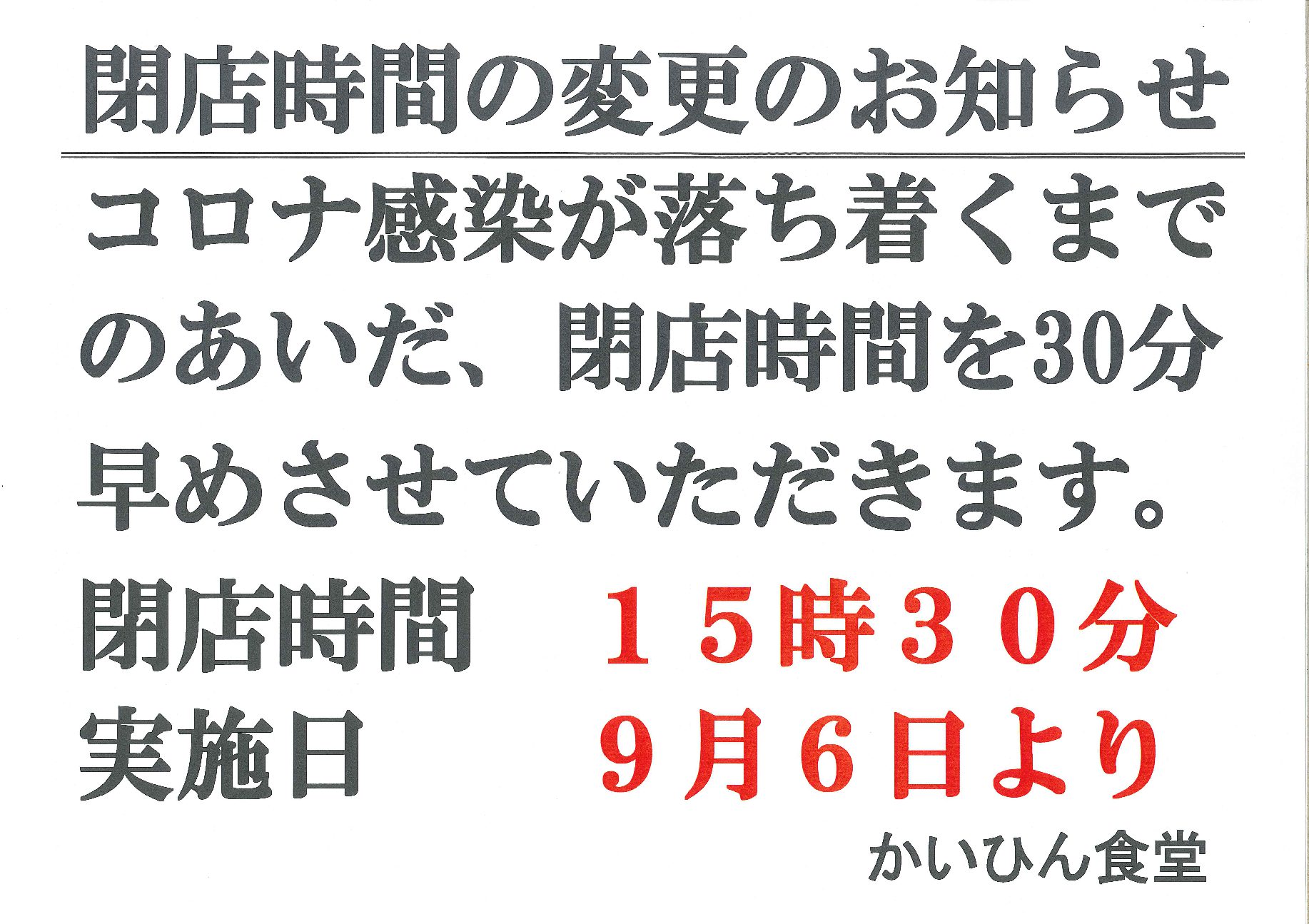 【営業時間変更のお知らせ】かいひん食堂 2021年9月6日より