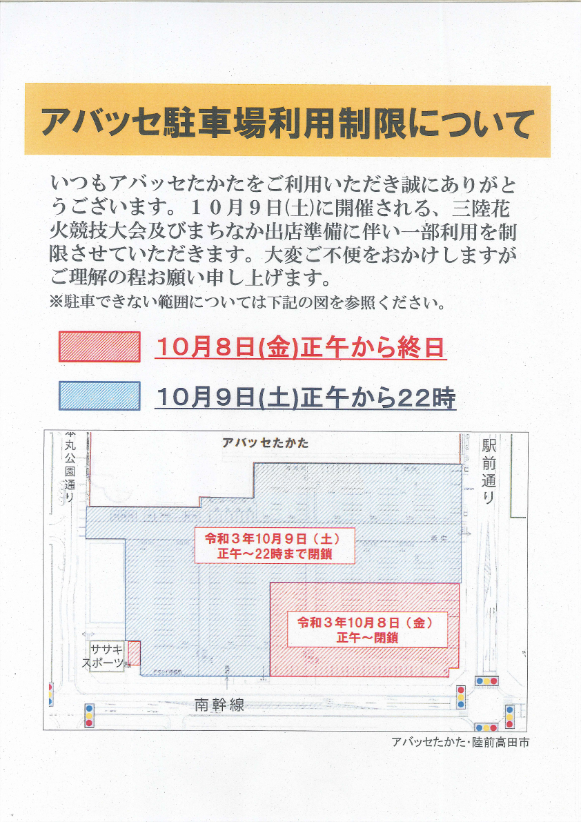 アバッセ前の駐車場は、一部は前日10月8日(金)12時から利用規制が行われます。