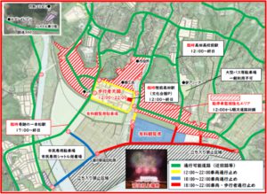 周辺の道路では、通行規制が行われますので、ご留意ください。