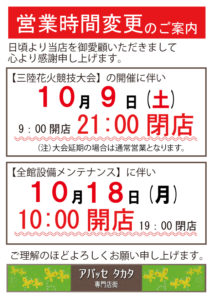 三陸花火競技大会の開催に伴い、アバッセタカタ専門店街の営業時間を変更いたします。