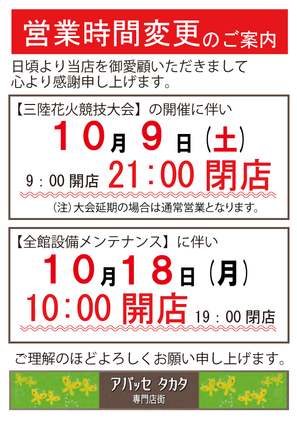 【営業時間変更のお知らせ】10月18日(月)