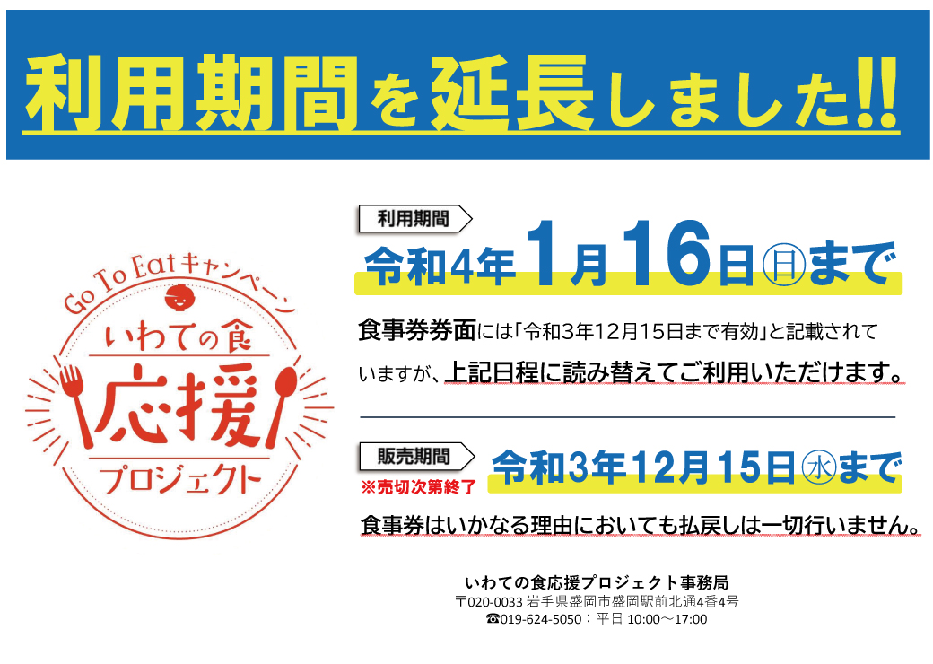 Go To Eat キャンペーン いわての食応援プロジェクトお食事券 利用期限延長