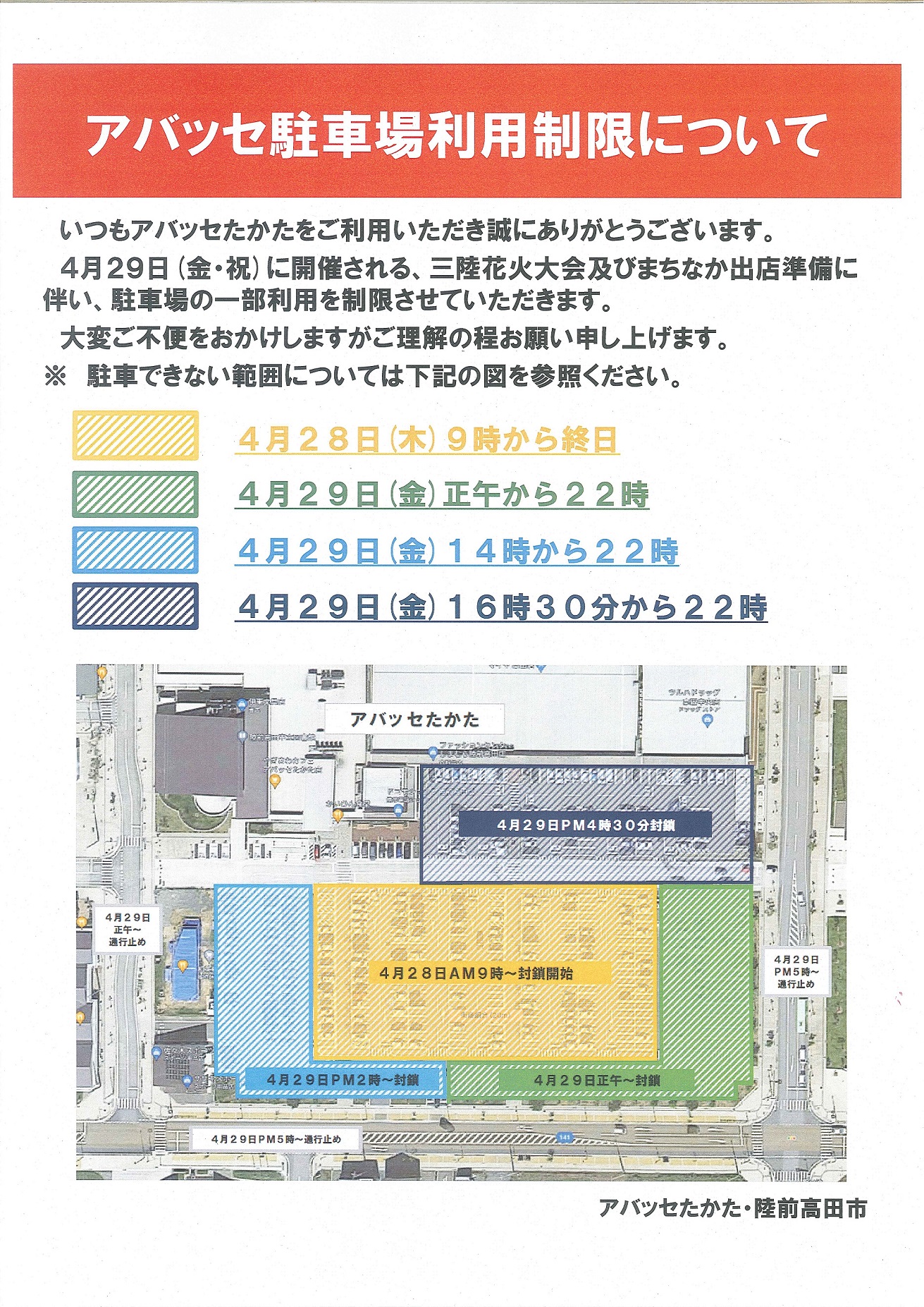 4月29日(金)に開催される【三陸花火大会】に伴い、駐車場の利用について規制がございます。