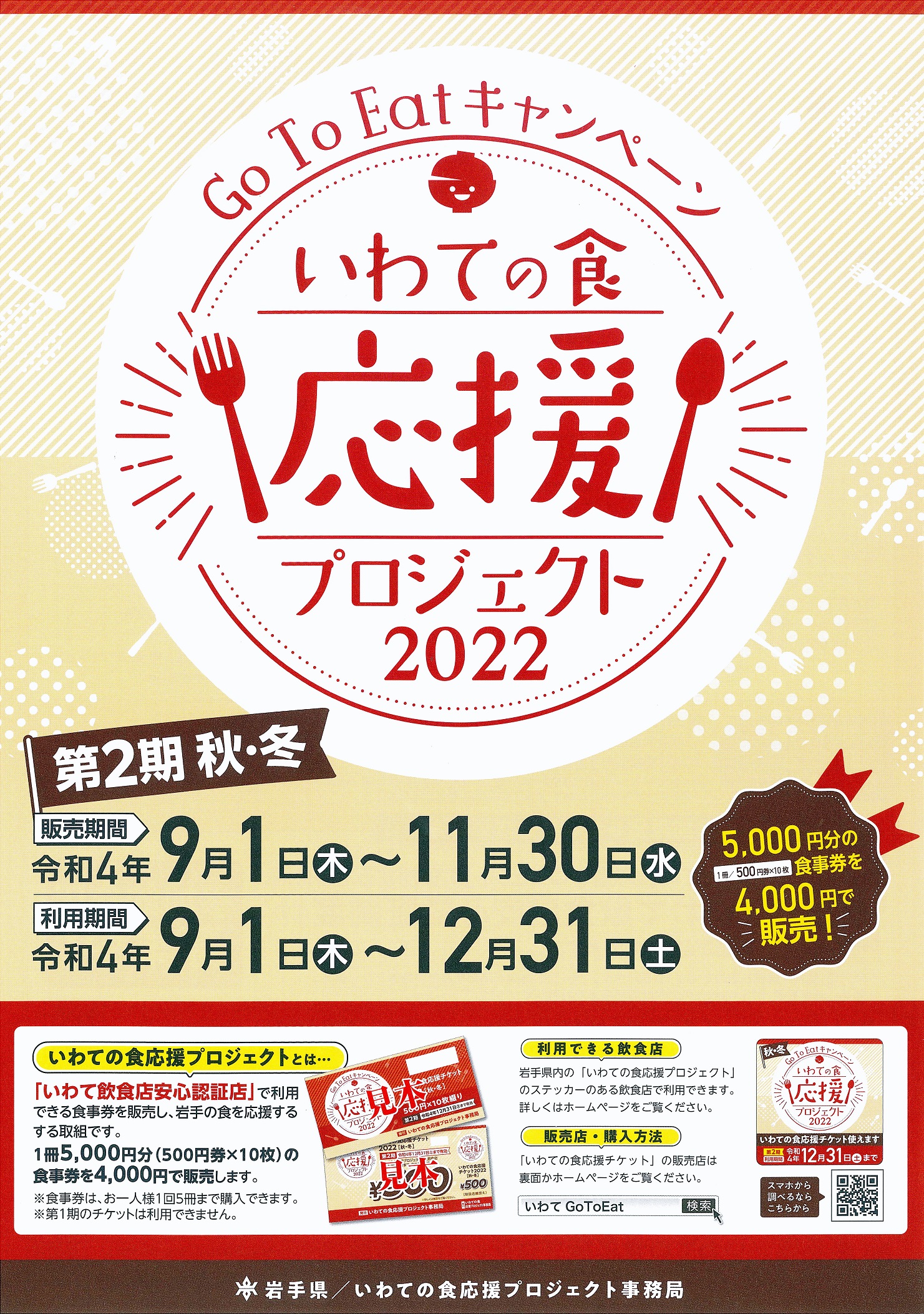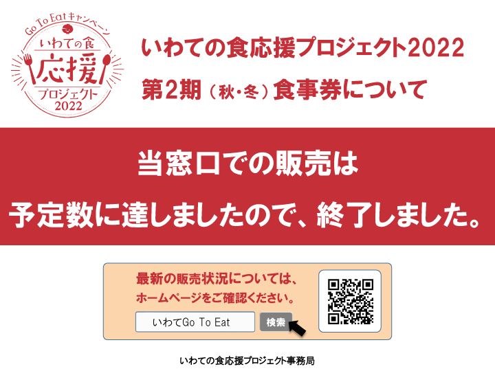 くわしくは、「いわての食応援プロジェクト事務局」ホームページでご確認ください。 → https://www.iwate-gotoeat.jp/index.html