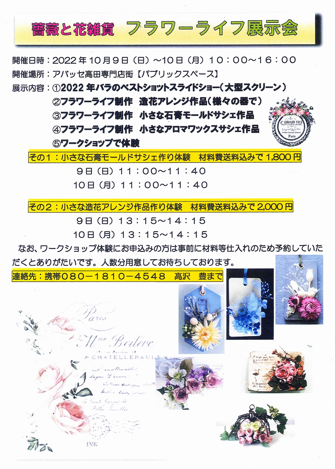 小さな造花のアレンジメント及び石膏モールドサシュを作成するワークショップも行います