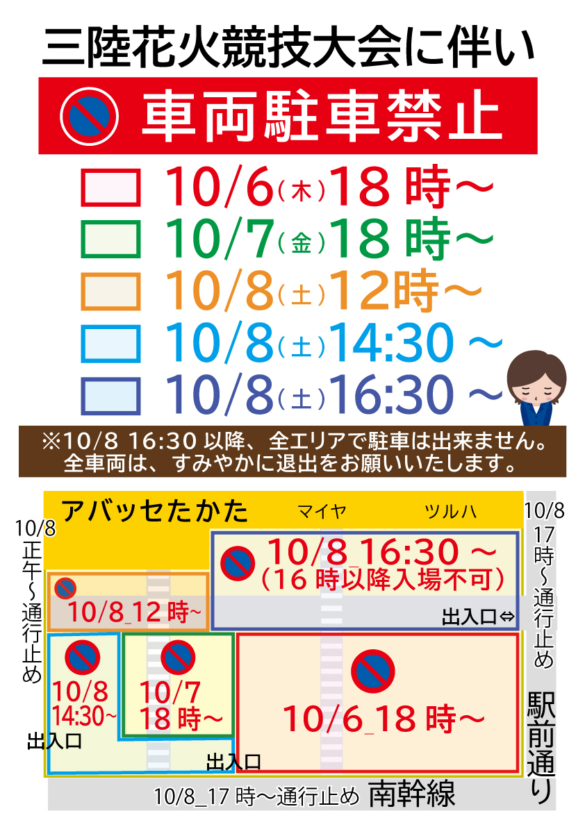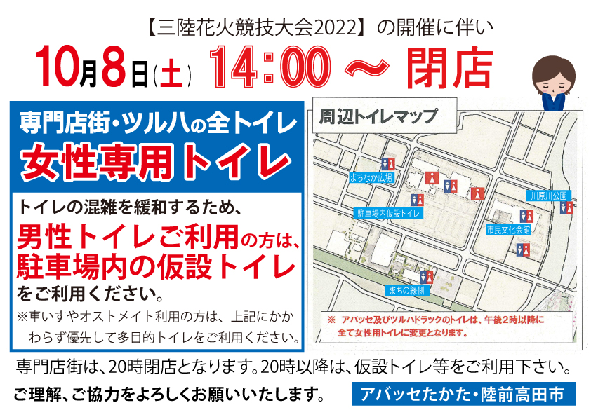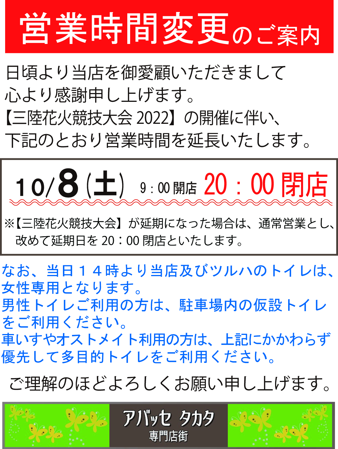 【三陸花火競技大会に伴うお知らせ】駐車規制、トイレ利用規制及び営業時間の変更