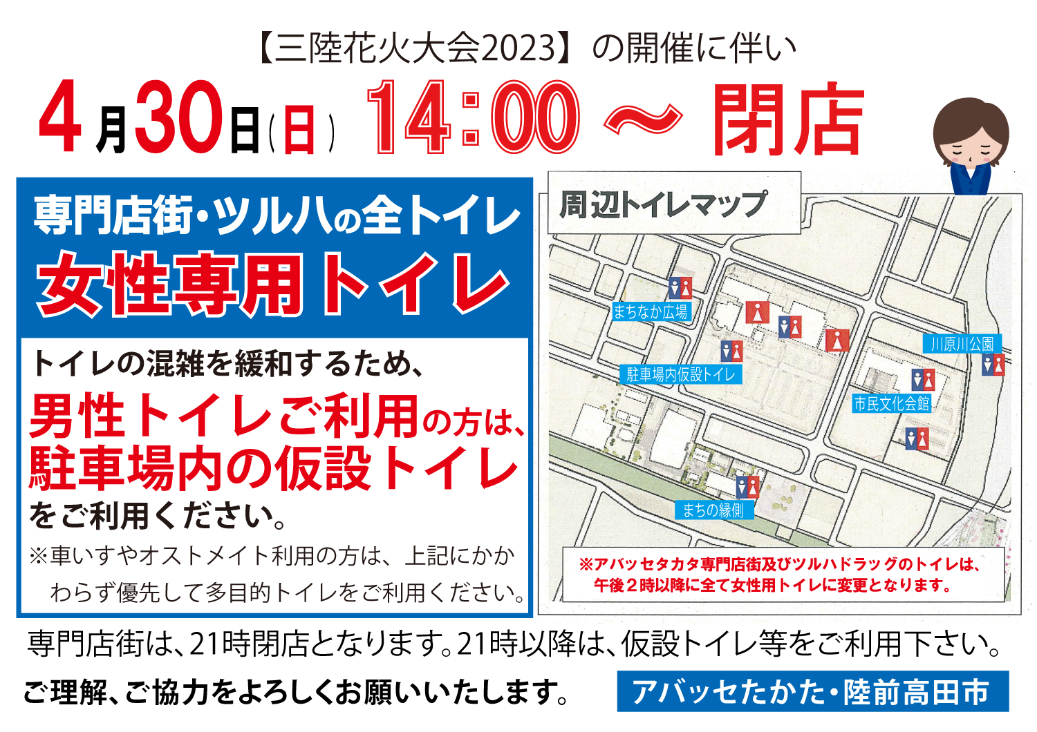 4月30日(日)三陸花火大会2023に伴う駐車場規制及びトイレ運用について