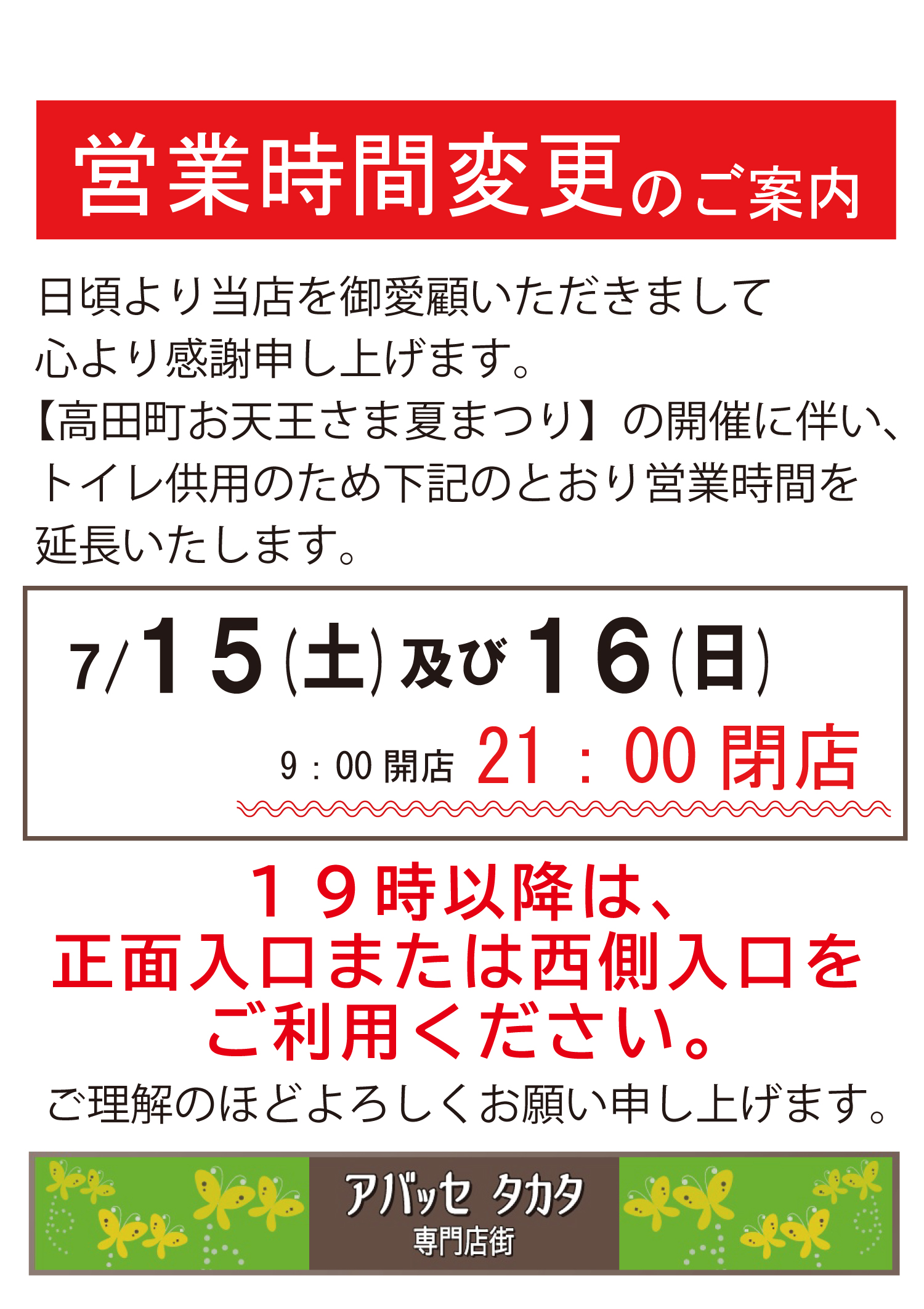 【7/15~7/16 営業時間変更】アバッセタカタ専門店街 21時閉店