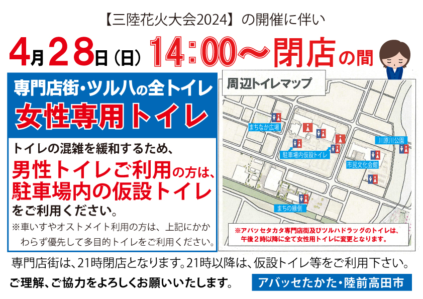 【4月27日~28日】三陸花火大会2024の開催に伴う駐車場及びトイレの利用規制について