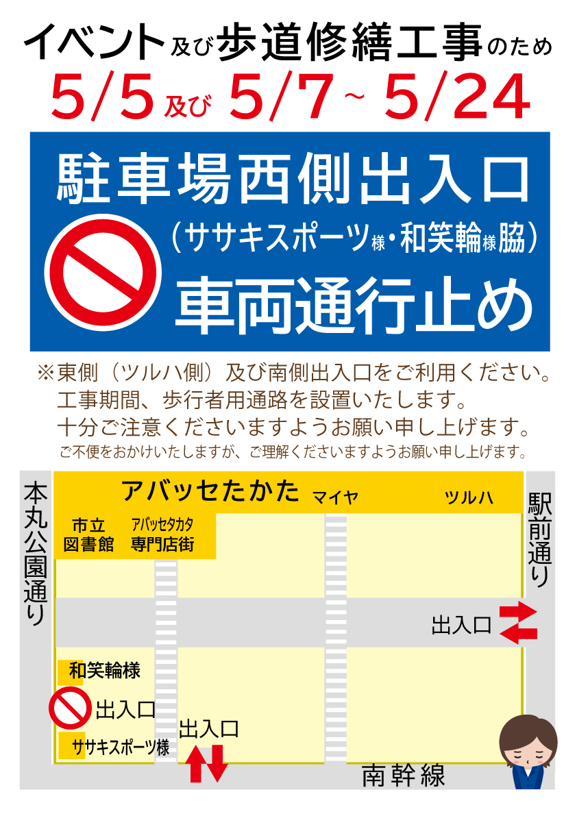 【5/5及び5/7~5/24】駐車場西側出入口の規制のお知らせ