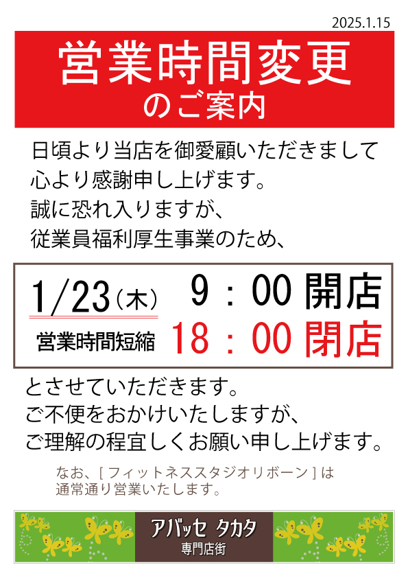 【営業時間変更のお知らせ】1月23日 アバッセタカタ専門店街