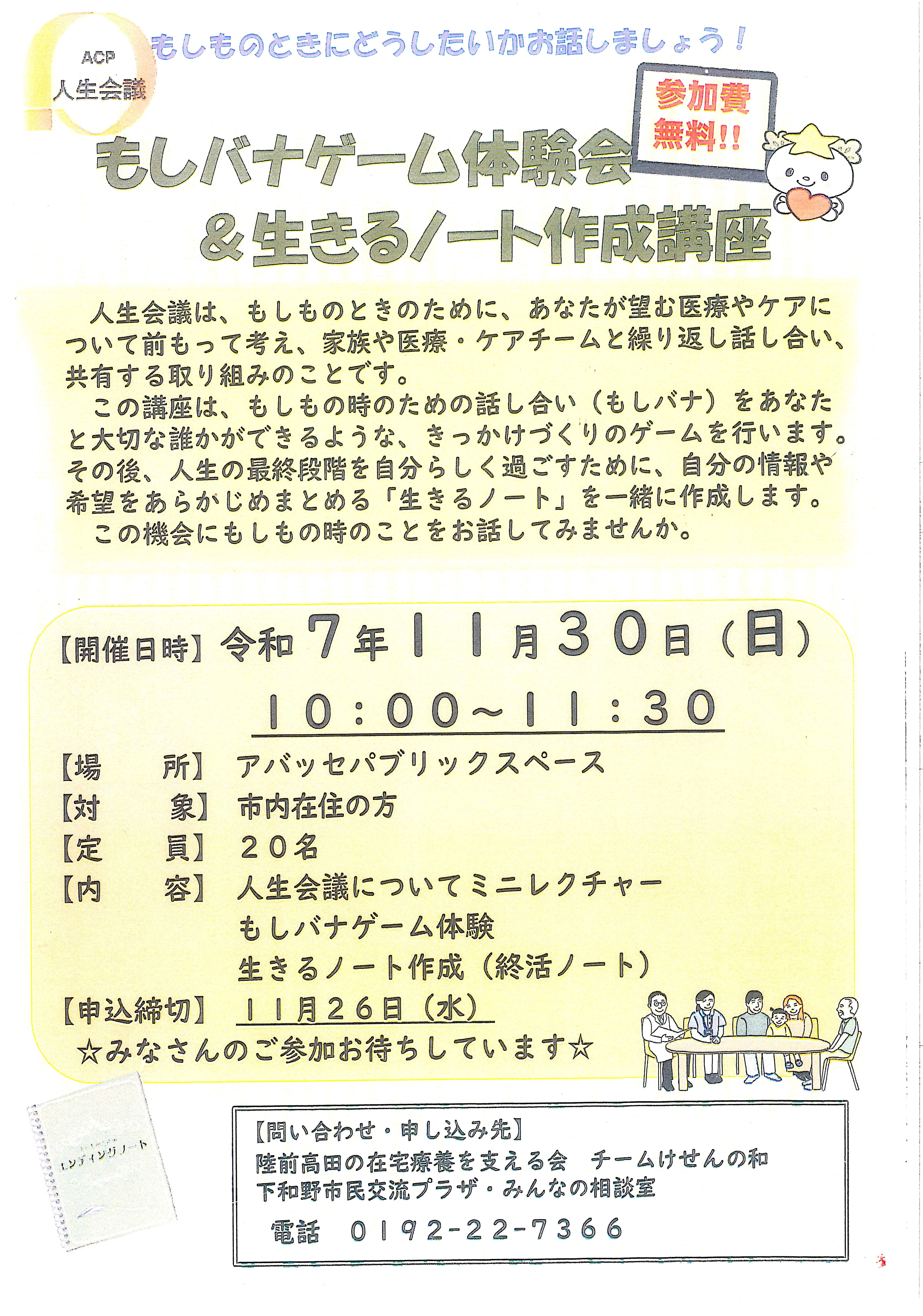 【申込先】陸前高田の在宅療養を支える会 チームけせんの和 電話番号:0192-22-7366