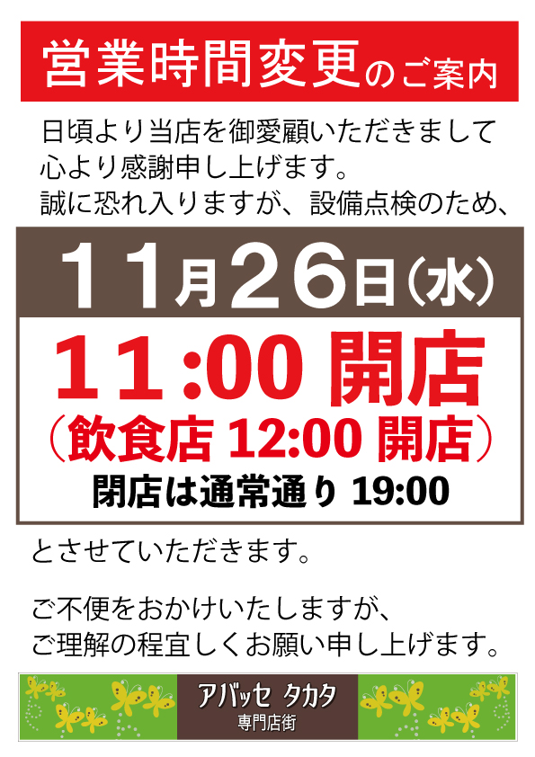 【開店時間変更のお知らせ】11/26 アバッセタカタ専門店街